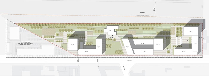 - un Parco pubblico lineare che vuole strutturare l’intero intervento in continuità sia con l’area più a nord, anch’essa destinata allo sviluppo residenziale, sia con l’area verde di futura previsione nei pressi di via Gaggia;