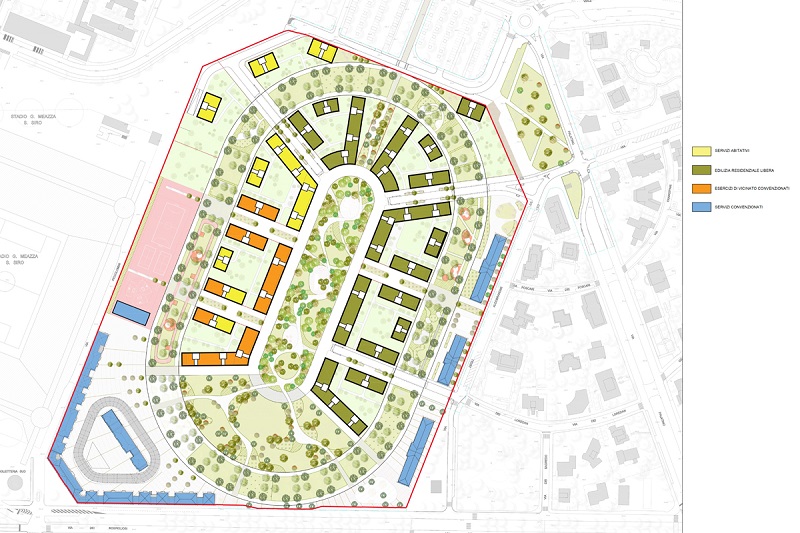 L’edificazione è organizzata in isolati interrotti da passaggi trasversali che collegano il giardino centrale all’anello verde perimetrale e agli edifici storici da recuperare a servizi posti sul margine del sito.