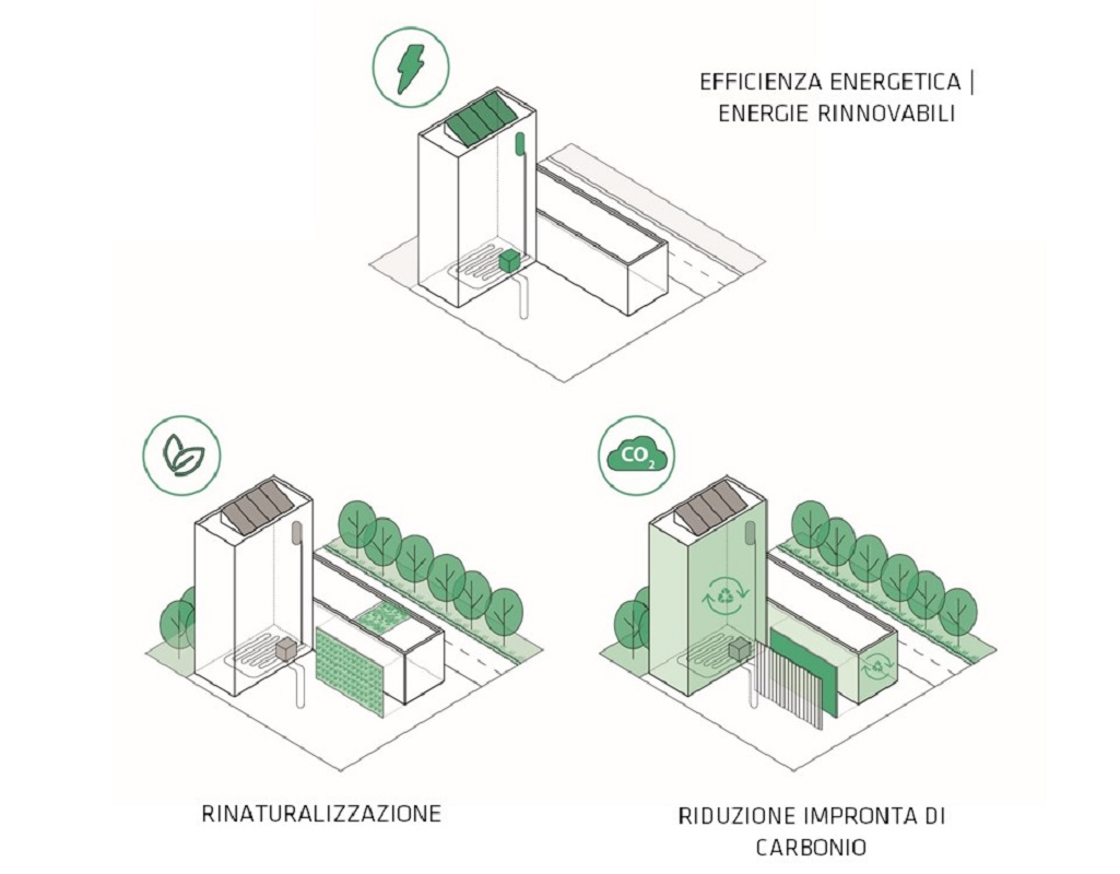 Per quanto riguarda l’edificato, si prevede l’innalzamento degli standard richiesti, con il miglioramento delle prestazioni energetiche, la realizzazione di nuove aree permeabili, anche attraverso “tetti verdi”, e la certificazione della riduzione di CO2.