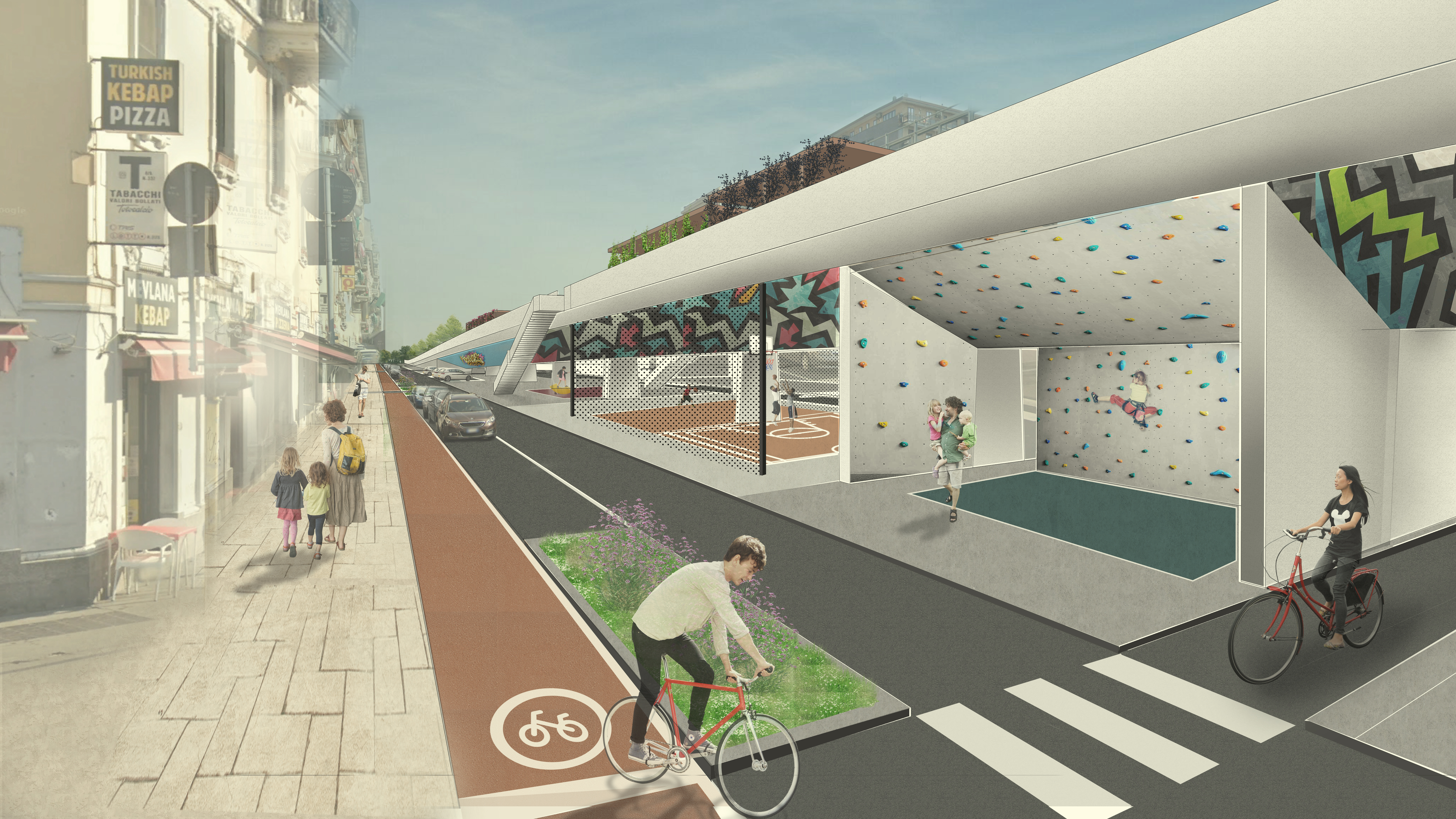 Ripensamento del cavalcavia per ricucire il tessuto urbano, rafforzando il mix funzionale, rimodulare il traffico veicolare, potenziando la mobilità ciclo-pedonale, ridurre l’esposizione all’inquinamento acustico e atmosferico e introdurre soluzioni innovative per l’adattamento climatico.