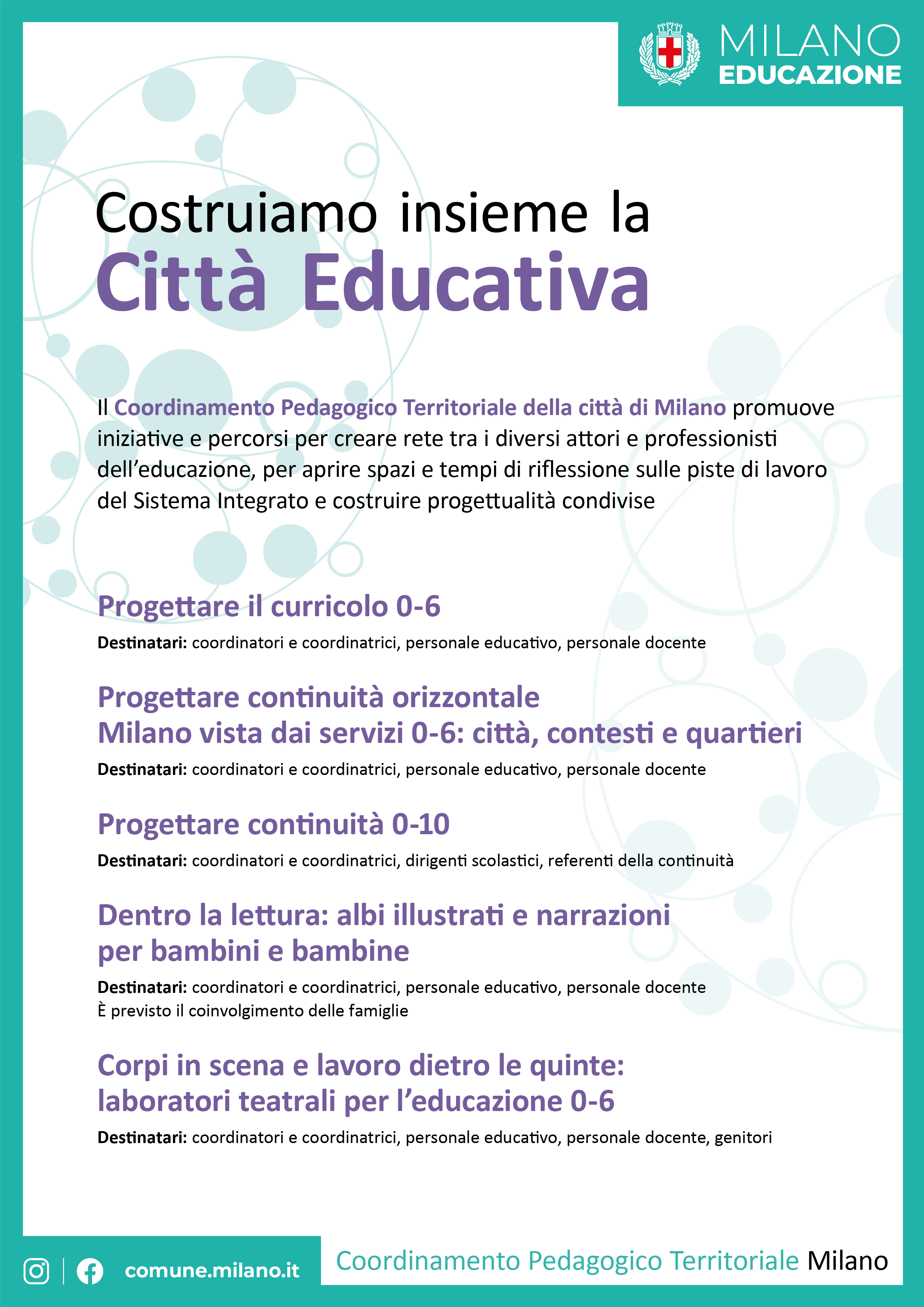 La proposta formativa 2025/2026 del Coordinamento Pedagogico Territoriale della città di Milano è dedicato a coordinatori e coordinatrici, personale educativo e personale docente e vede il coinvolgimento delle famiglie.