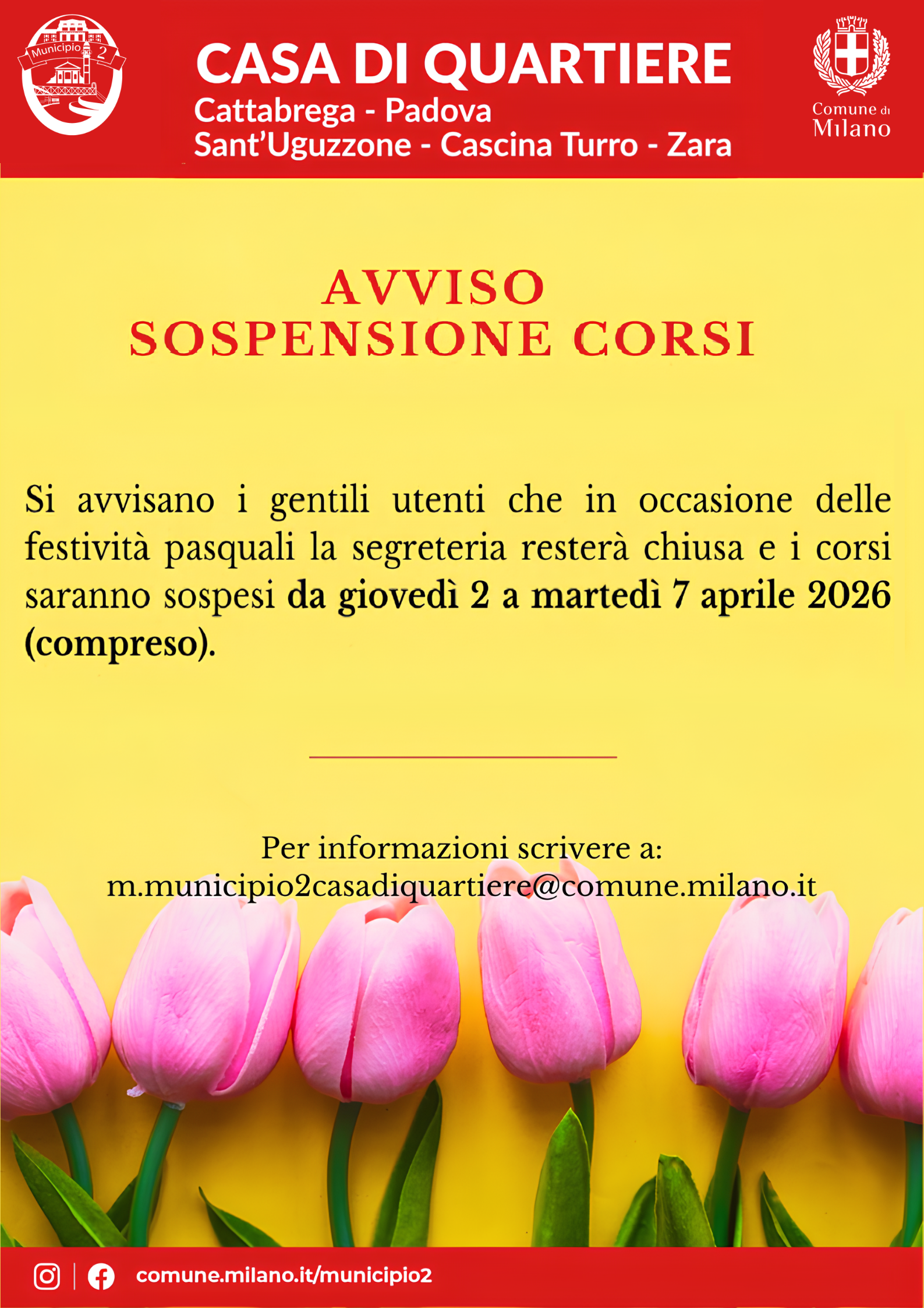 In occasione delle prossime festività pasquali, in tutte le Case di Quartiere del Municipio 2, dal 02 al 07 aprile 2026 la Segreteria resterà chiusa e i corsi saranno sospesi.